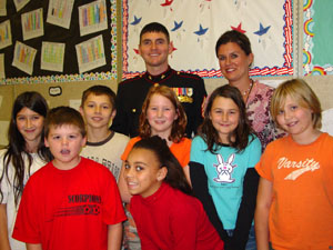 ![]() SSgt. Bradford poses with his sister, Mrs. Owens, and some of the students who wrote to SSgt. Bradford while he was in Fallujah, Iraq in the Spring of 2005. |