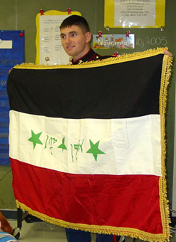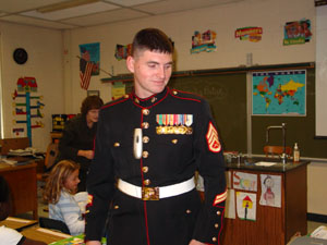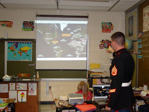 ![]() SSgt. Bradford showed the students many pictures from Iraq and began by showing them how far apart we are on a world map. Learning map skills is the current social studies lesson in 4th grade. |