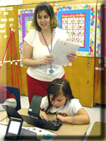 Grade 1 First grade students in Mrs. Spicer's class showed everyone that they, too, can use Palm handhelds and keyboards. They had fun taking a Friday spelling test in Memo Pad. Mrs. Spicer printed their tests as soon as they finished. These first grade students really enjoy using Palms! |
