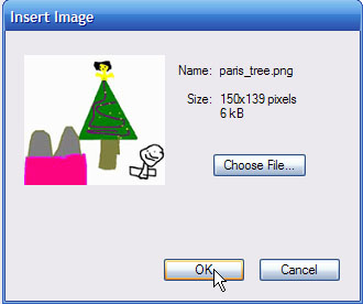| A small "Insert Image" window will open.  Click on "Choose file."  Another small window will open where you can browse folders to find your image.  Click on "Open."