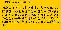 Today Naomi who is in the second grade, wrote and drew her day in a life. This time she finished her morning affairs. she wrote, In the morning I get up at seven everyday. And I have breakfast with her parents and her younger sister. But she left alone then. Because her father goes to work, and her mother and her younger sister go to sisters nursery school. Then she clean her teeth. This is a picture in her morning life.